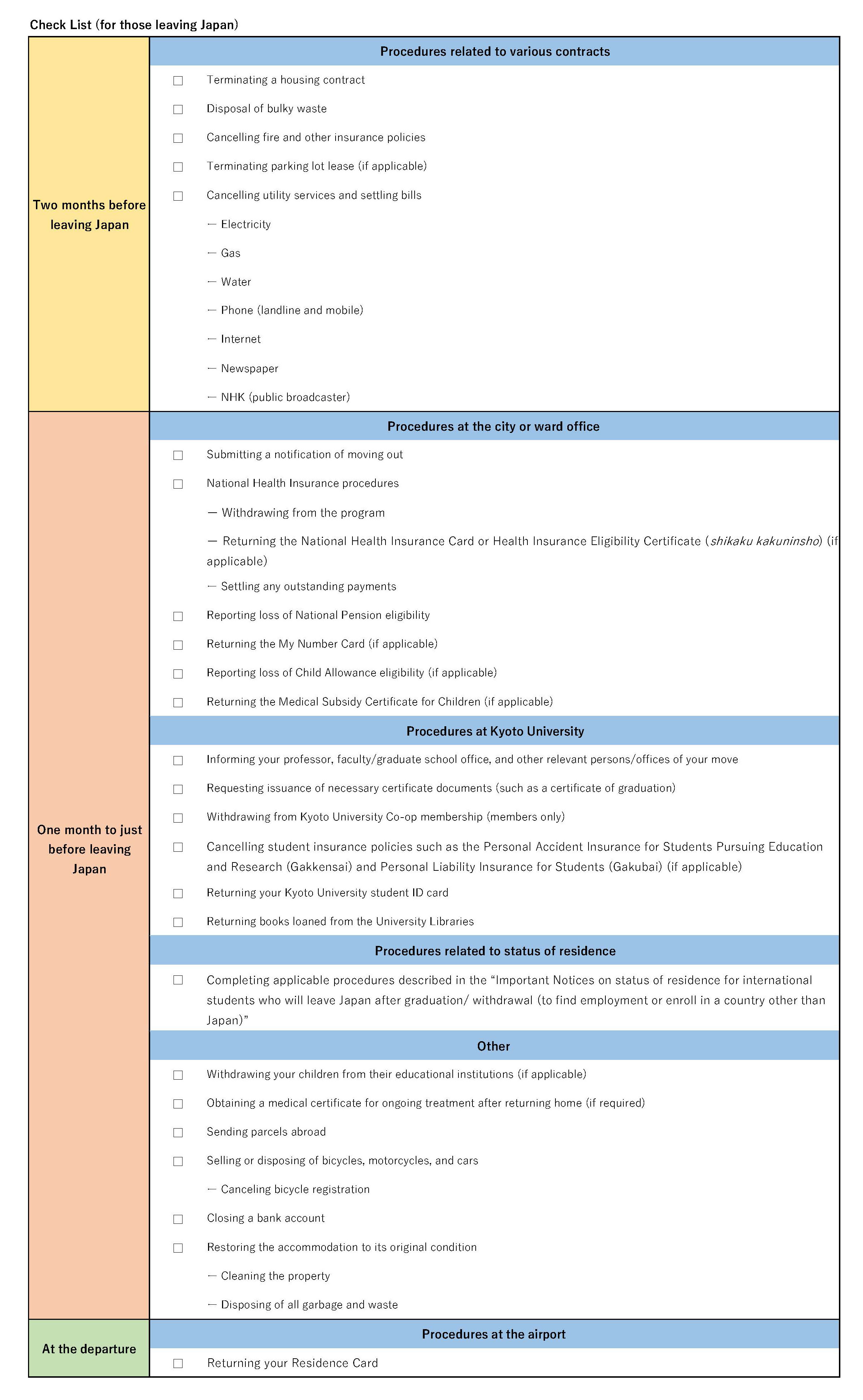 This page outlines the procedures that must be completed when leaving Kyoto University due to graduation, withdrawal, or other reasons.