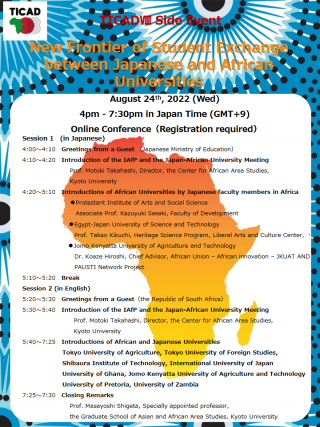 The "Innovative Africa: Educational Networking Programs for Human Resource Development in Africa's SDGs" (Innovative Africa Program, or IAfP) will present on Wednesday 24 August the Second IAfP Africa Japan University Education Exchange Meeting, themed "New Frontier of Student Exchange Between Japanese and African Universities".