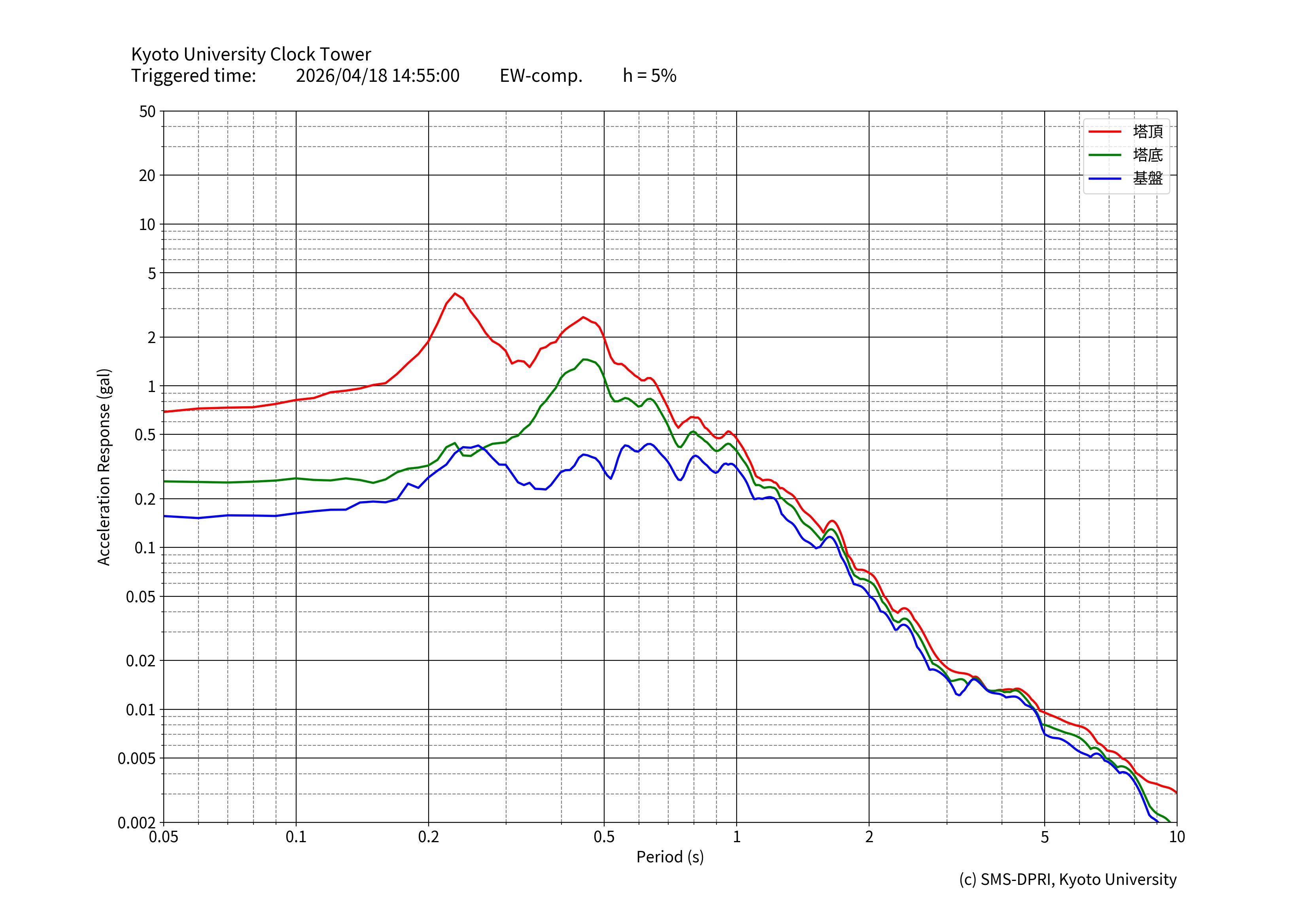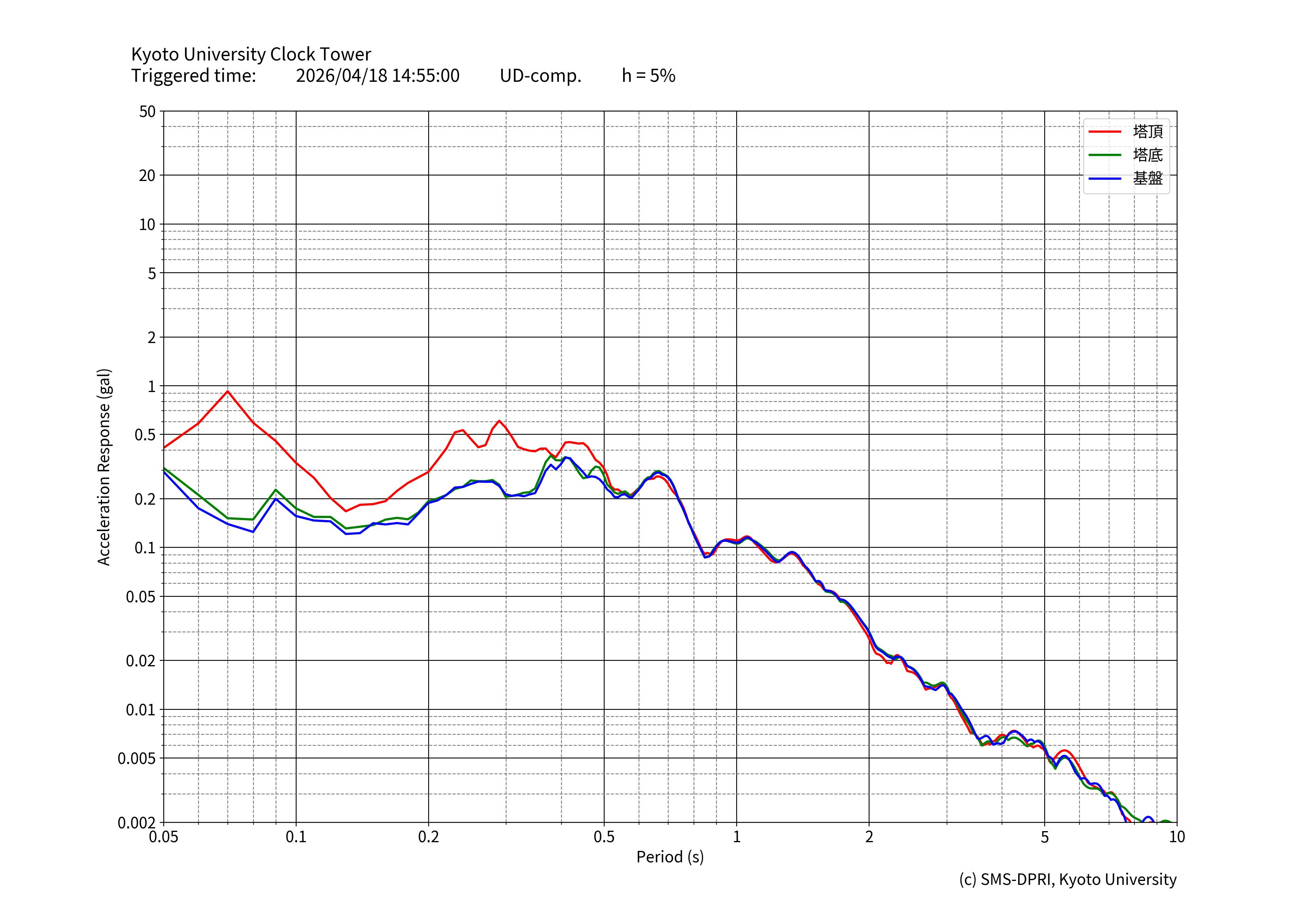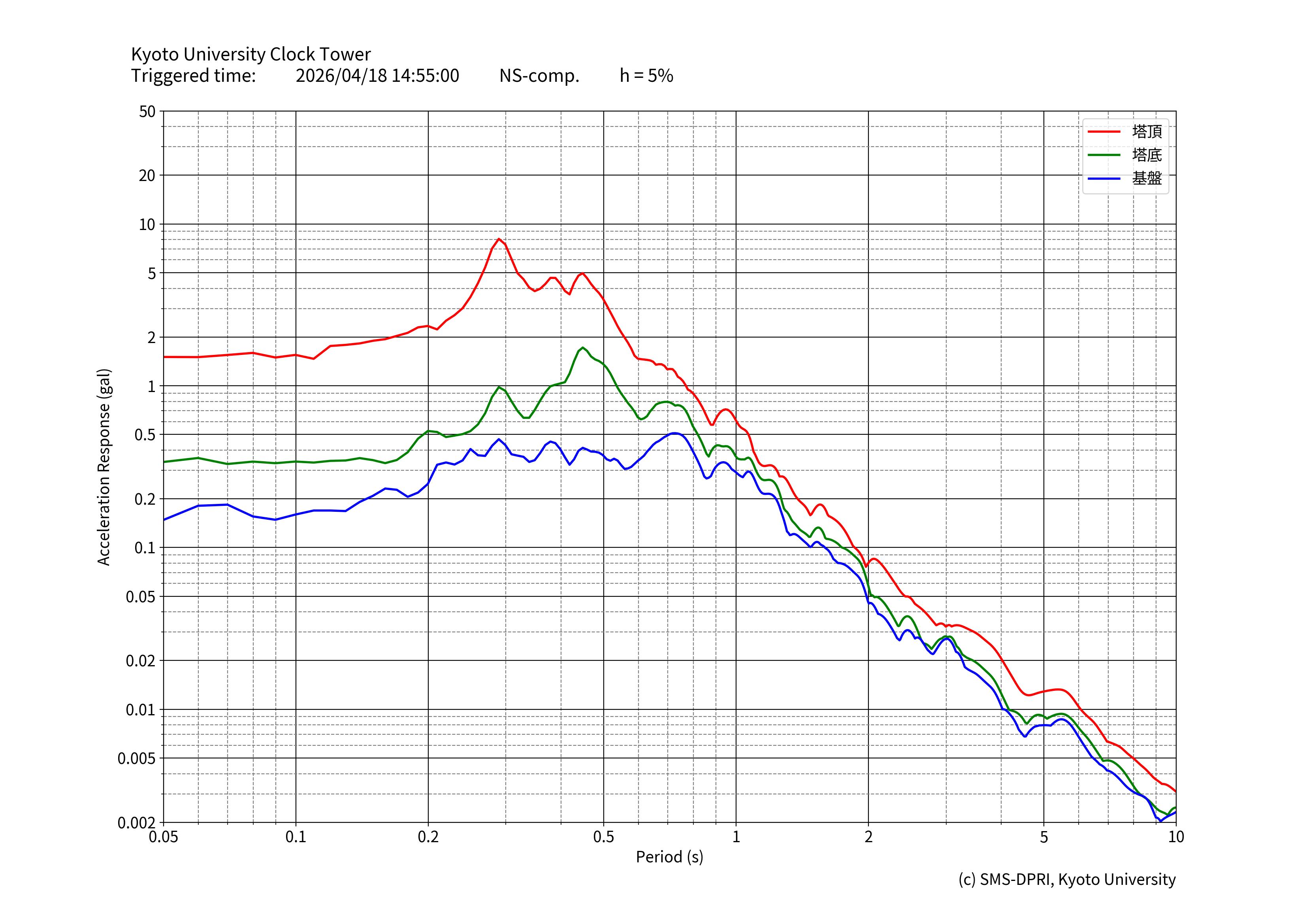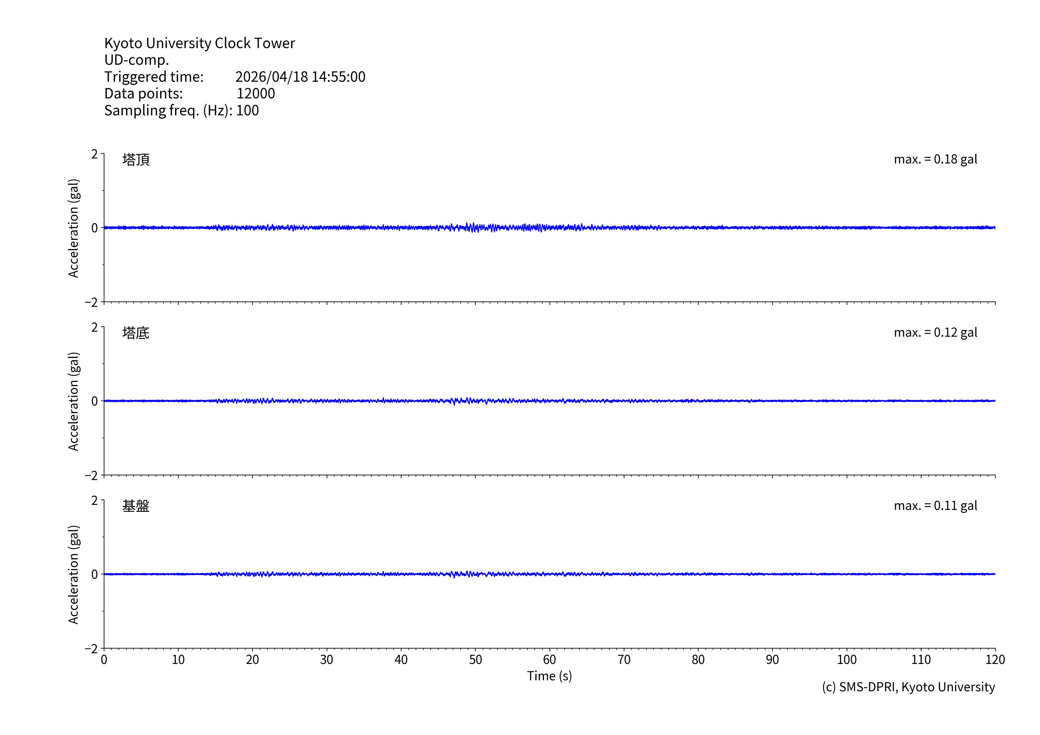 時計台記念館には、基礎地面(基盤)、建物底(塔基礎)、および時計台塔(塔頂)の3カ所に研究用の地震計が設置されています。地震計は、有感地震が起きると収録を行います。このページでは、収録された揺れの記録と計測震度相当値、およびその揺れの特徴の図面を公開しています。