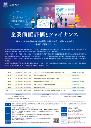 Events タグ 公開講座 京大MBA 2025 短期集中講座「企業価値評価とファイナンス 」資本コストや株価(PBR)を意識した経営が当たり前になる時代に必要な経営リテラシー 開催日 2025年11月21日 開催地 吉田キャンパス 東京オフィス・京都アカデミアフォーラム オンライン