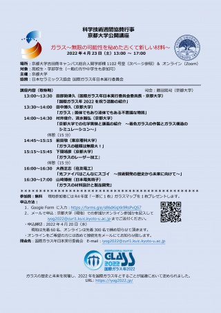 京都大学では、ガラス関係4研究室(工学研究科 3、人間・環境学研究科 1)が「京都大学公開講座:ガラス~無限の可能性を秘めた古くて新しい材料~」を吉田南構内総合人間学部棟で4月23日(土曜日)に開催することになりました。