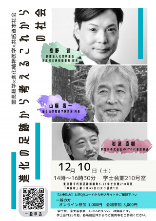 | 15時40分~16時30分 | 第3部対談「進化の足跡から考えるこれからの社会」 山極壽一 総合地球環境学研究所長 高野覚 医療法人社団明雄会本庄児玉病院理事長 岩波直樹 非営利株式会社EUMO代表取締役 |